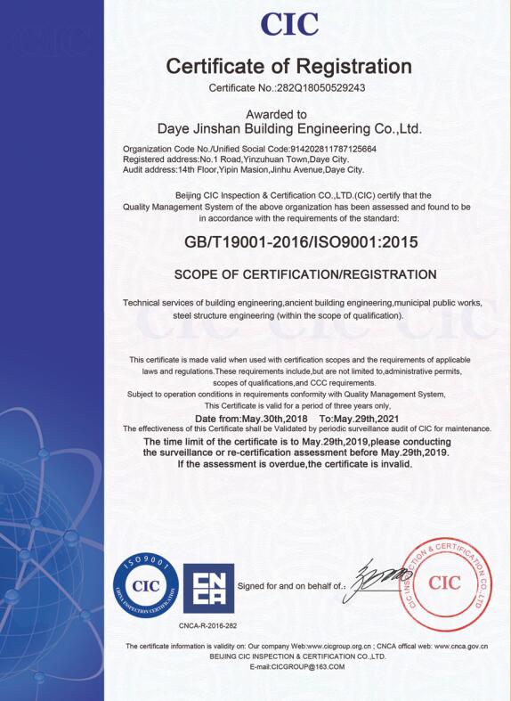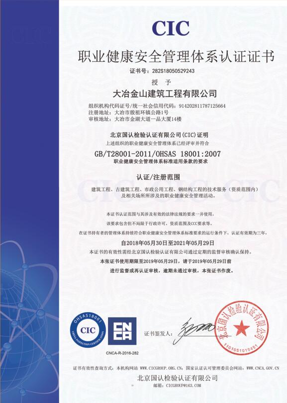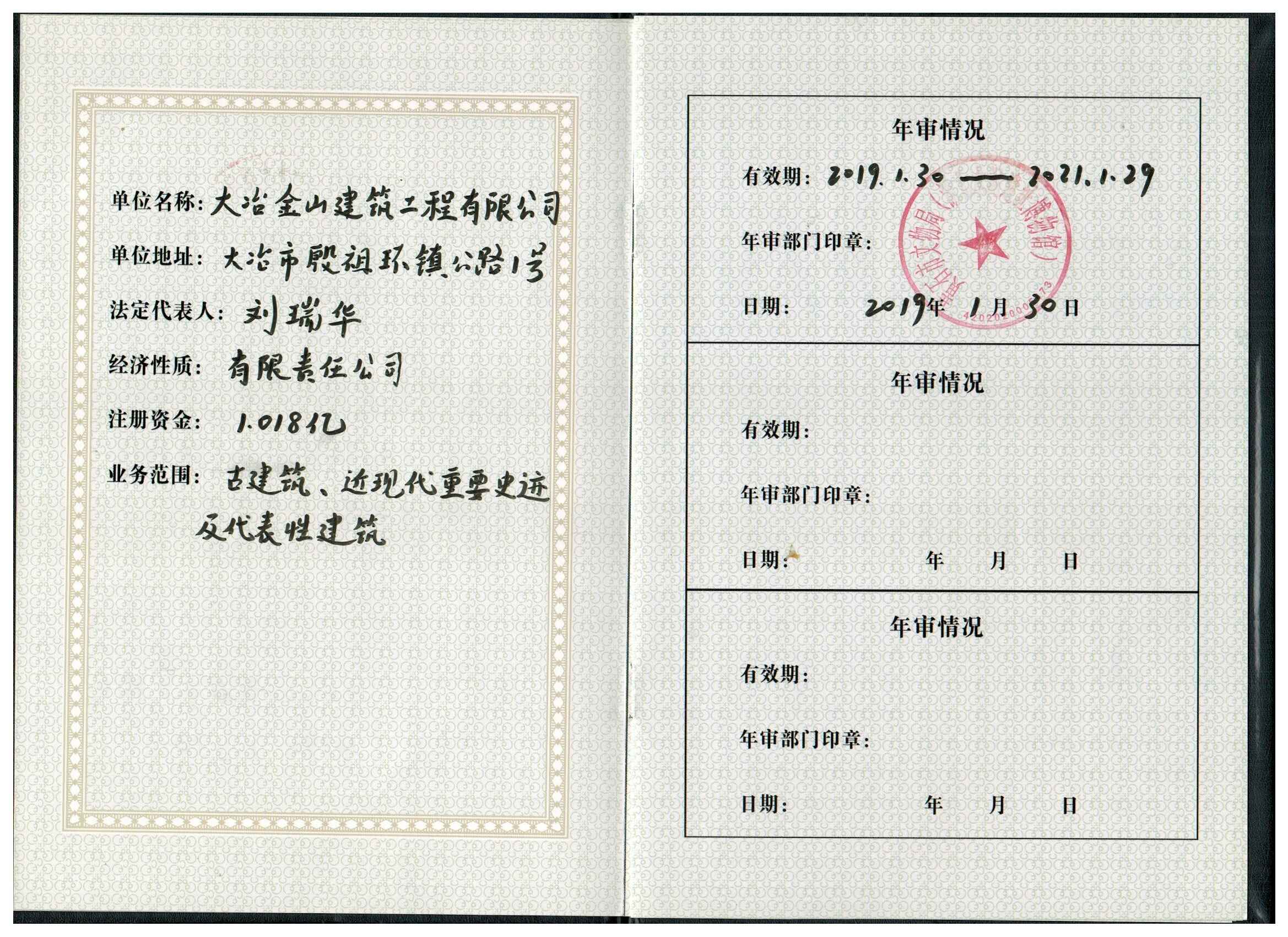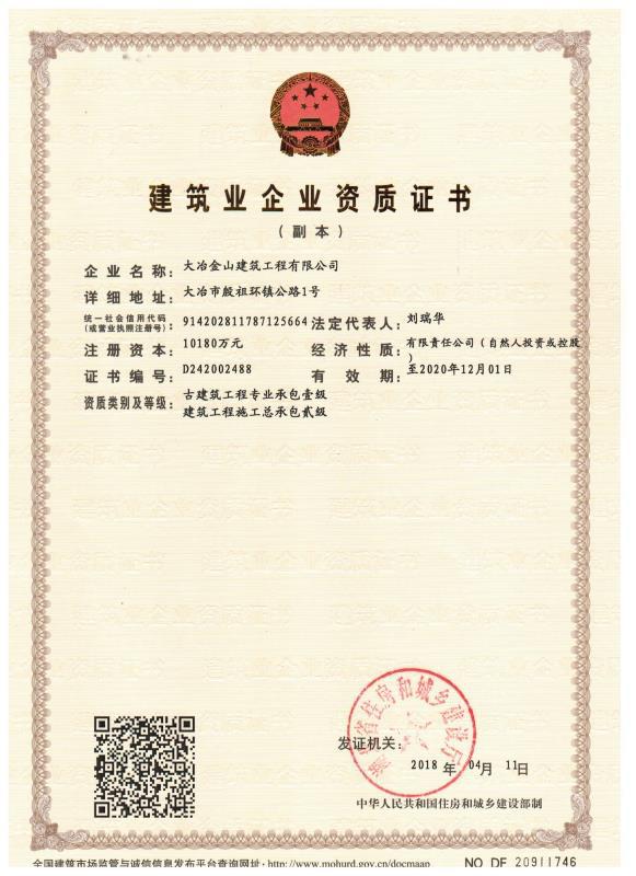 大冶金山建筑工程有限公司始建于1984年,屬鎮(zhèn)辦集體企業(yè)。1997年改制為大冶山建筑工程有限責任公司,屬股份制企業(yè)。2013年更名為大冶金山建筑工程有限公司,2018年3月公司資源重組,公司注冊資金達到10180.00萬元,公司法定代表人為劉瑞華。公司具有古建筑工程專業(yè)承包壹級、建筑工程施工總承包貳級、市政工程總承包叁級、鋼結構工程專業(yè)承包叁級資質(zhì)。