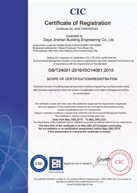 環(huán)境管理體系認證證書...